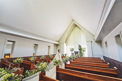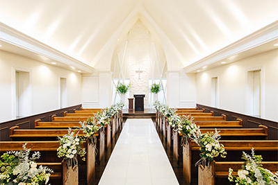 やわらかな自然光が降り注ぐ、開放的な独立型チャペル。オルガンや讃美歌が美しく響き渡り、おふたりの感動的な誓いのシーンを演出します。