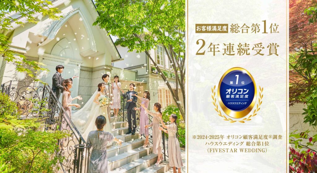 定禅寺ガーデンヒルズ迎賓館を含むFIVESTAR WEDDINGが、2025年 オリコン顧客満足度®調査 「ハウスウエディング」ランキングで、「サロンの雰囲気・清潔さ」 「ドレス・衣装」 「装花」 「引き出物」 「式場」 「式・披露宴」 「ヘアメイク」 など、全13項目で評価され、2年連続総合第1位(FIVESTAR WEDDING)を受賞いたしました!