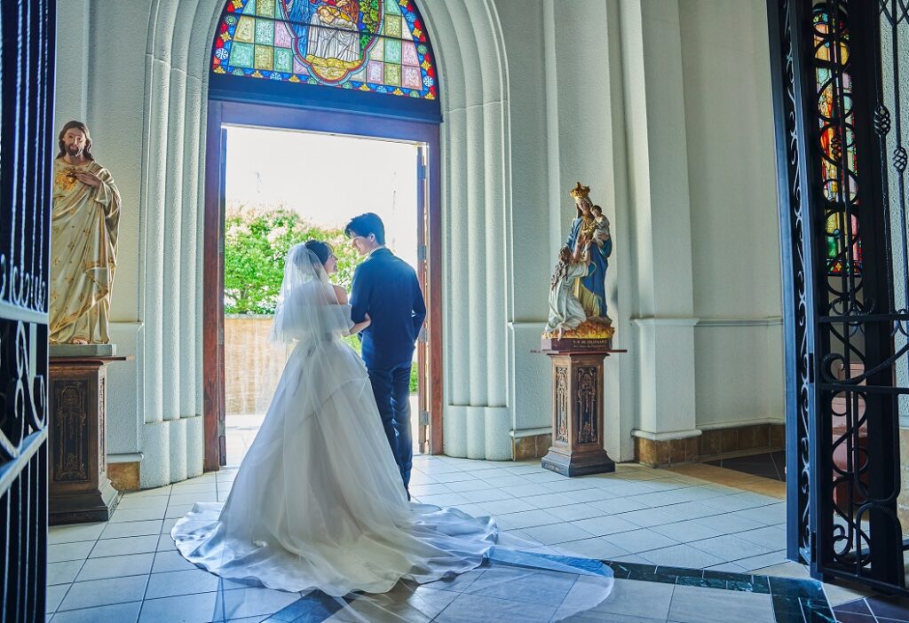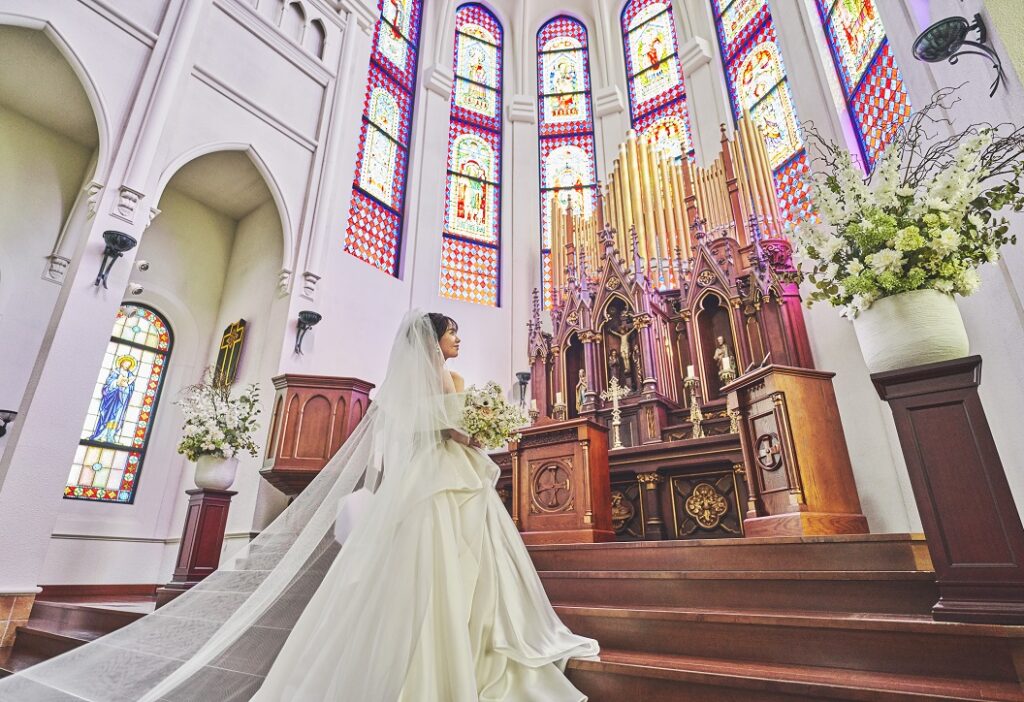 祭壇が高い位置にあると、後ろの方の席に座っているゲストからも新郎新婦がハッキリ見えます。特にゲスト数が多く、広いチャペルでの挙式をお考えでしたら、祭壇の高さは大事なポイントです。また、祭壇に高さがあると、ウェディングドレスのトレーンが映えるというメリットもあります。