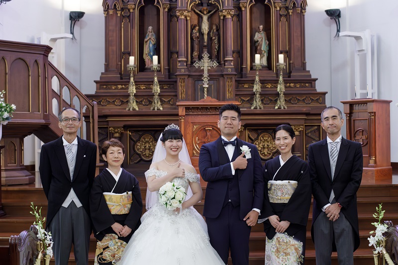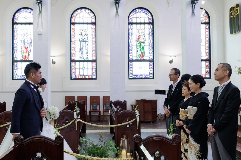 ノートルダム北九州では、ステンドグラス煌めく大聖堂にてファミリーミートをご提案しております。ファミリーミートの瞬間を写真に残す場合も、背景がチャペルなので、美しい一枚に仕上がります。