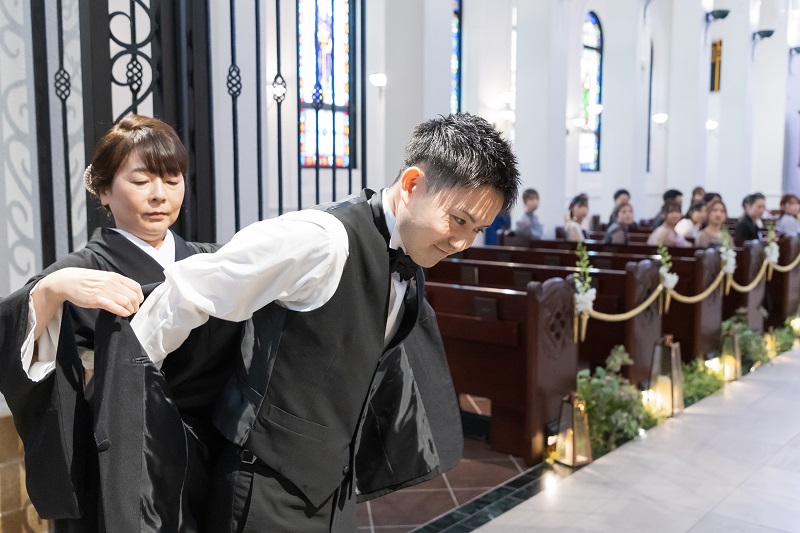 ジャケットセレモニーとは、新郎の身支度の仕上げとしてジャケットを着せてもらい、挙式へと送り出してもらう演出。