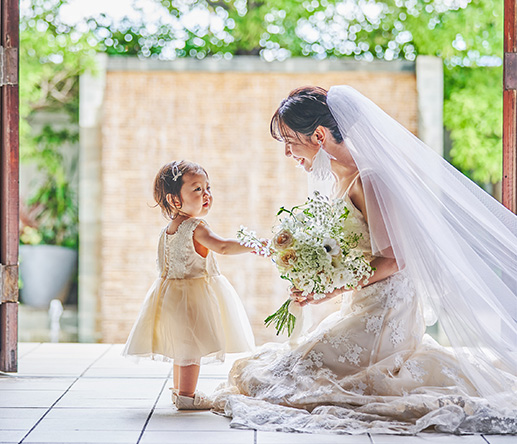 館内のドレスショップでは、マタニティ専用のドレスも多数ご用意。挙式当日のサイズ変化を見越したフィッティングを行い、当日は専属のスタイリストが一番美しい着こなしをサポートいたします。