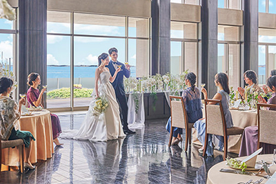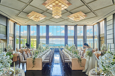 遊び心とセンスが光るItalian Modern Style。装飾の花や小物のテイストでアレンジしやすい白基調の会場と一面のパノラマに広がる青い空と海のコ ントラストは圧巻です。