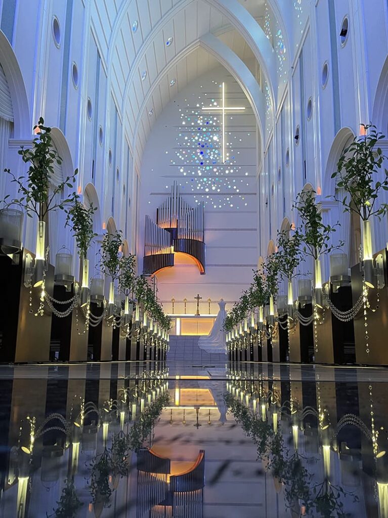 また大聖堂内の造りにも特徴があり大聖堂内の壁や床の色をあえてオフホワイトなどの色にすることで新婦様のドレスが来ていただいたゲストの方々にはっきり見えるような造りになっております