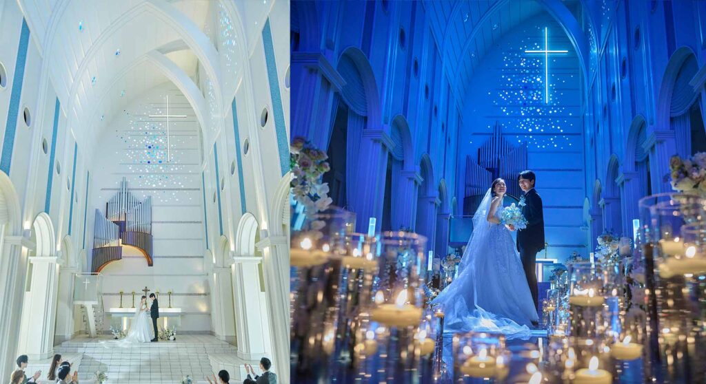 また大聖堂内の造りにも特徴があり大聖堂内の壁や床の色をあえてオフホワイトなどの色にすることで新婦様のドレスが来ていただいたゲストの方々にはっきり見えるような造りになっております