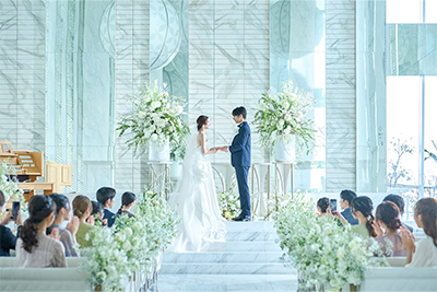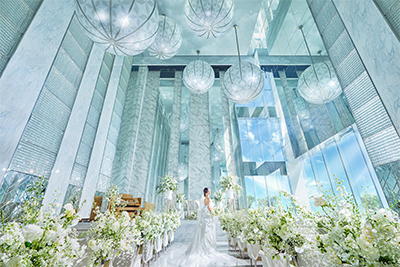 空旅をイメージした壮大なスケールの教会。大きな窓から光が降り注ぐ純白のその空間は、訪れた人全てを感動で包み込む唯一無二の場所。
