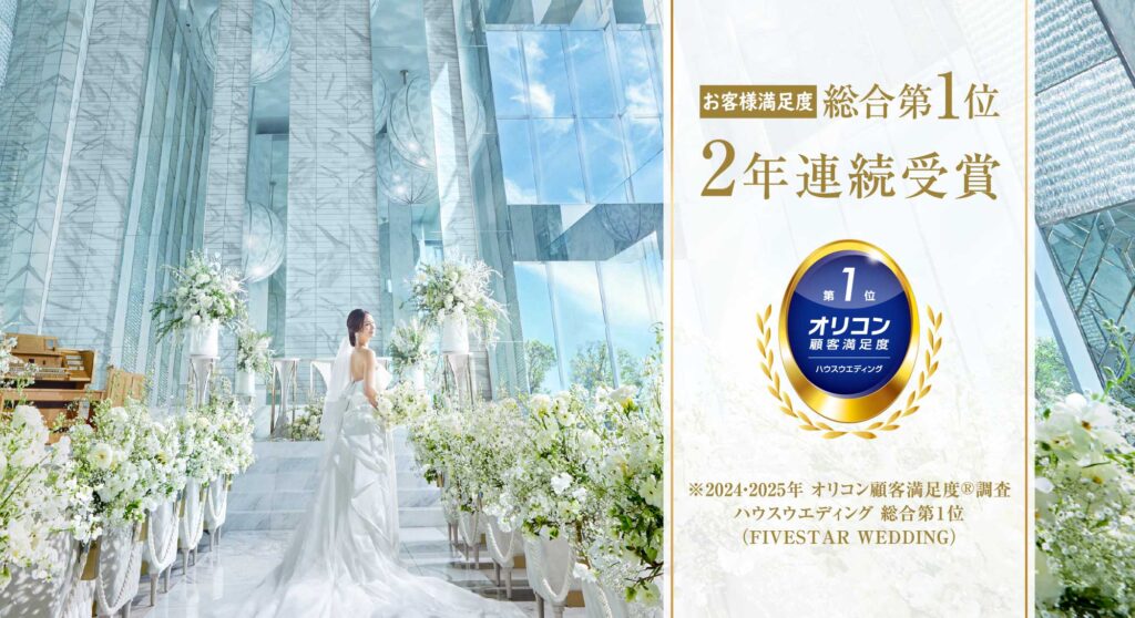大阪ONEを含むFIVESTAR WEDDINGが、2025年 オリコン顧客満足度®調査 「ハウスウエディング」ランキングで、「サロンの雰囲気・清潔さ」 「ドレス・衣装」 「装花」 「引き出物」 「式場」 「式・披露宴」 「ヘアメイク」 など、全13項目で評価され、2年連続総合第1位(FIVESTAR WEDDING)を受賞いたしました!