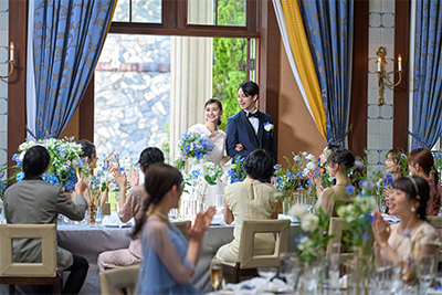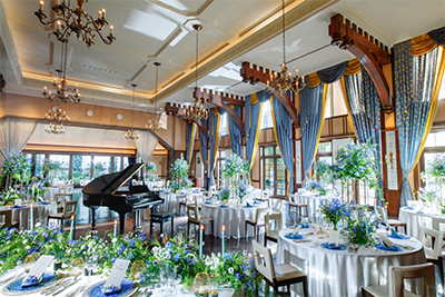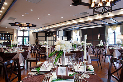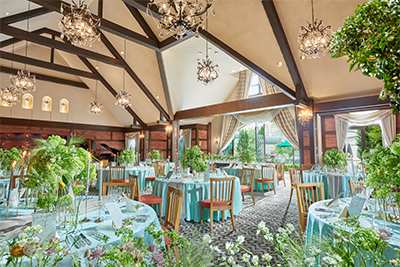 おふたりだけの貸切空間でゲストと過ごす至福のとき。テーブルを彩るのはシェフこだわりのオリジナルメニュー。レストラン内のプライベートスペースには専用チャーチも。