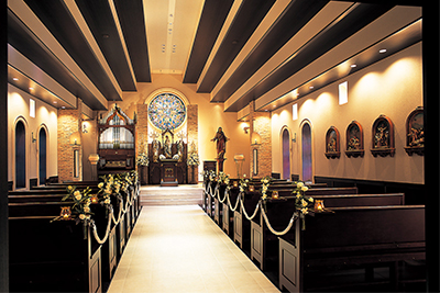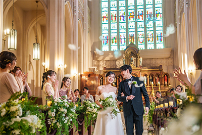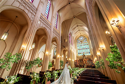 大聖堂の色鮮やかなステンドグラスから差し込む鮮麗な光でドレスをより魅力的に♪