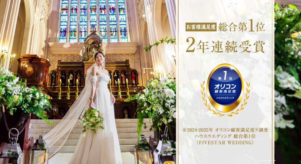 アンジェリカノートルダムを含むFIVESTAR WEDDINGが、2025年 オリコン顧客満足度®調査 「ハウスウエディング」ランキングで、「サロンの雰囲気・清潔さ」 「ドレス・衣装」 「装花」 「引き出物」 「式場」 「式・披露宴」 「ヘアメイク」 など、全13項目で評価され、2年連続総合第1位(FIVESTAR WEDDING)を受賞いたしました!