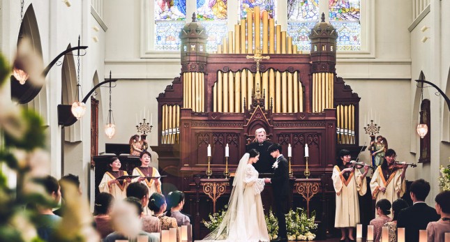 天井高20mから光り輝くステンドグラスがおふたりの未来を照らしてくれます。