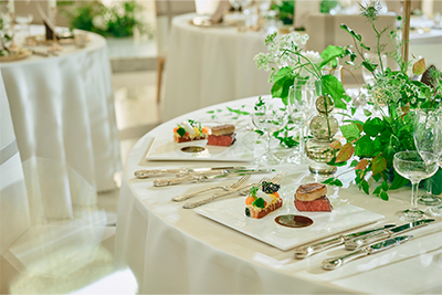 白を基調とした大人可愛い上質なパーティ会場。選び抜かれた調度品やシャンデリアの輝きが、優雅に流れる幸せなひとときを演出します。