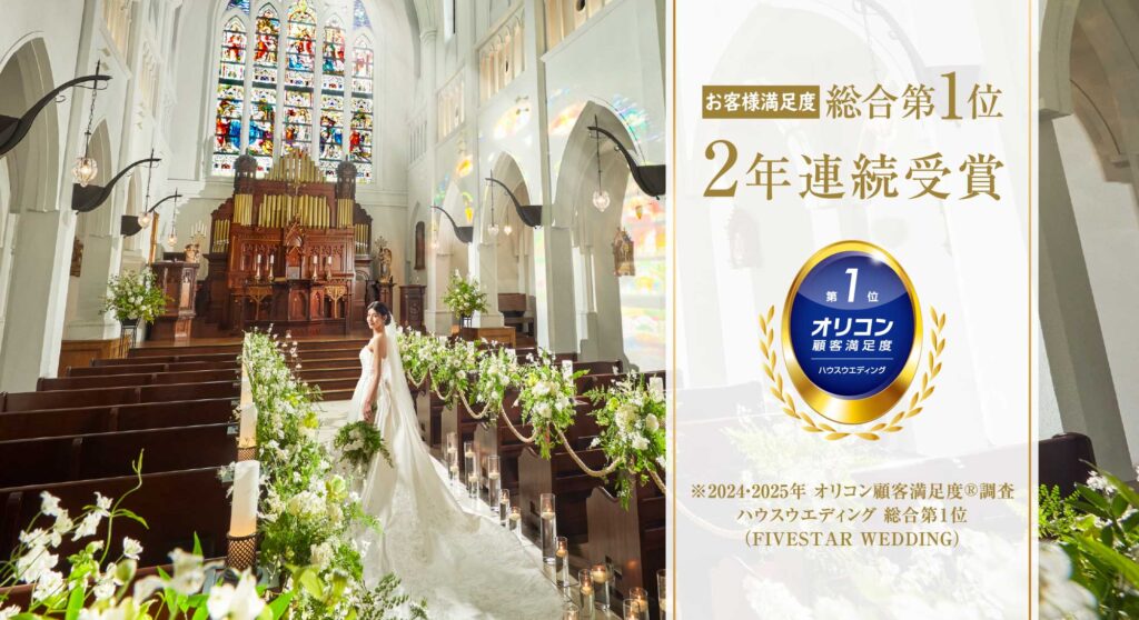 ノートルダム周南を含むFIVESTAR WEDDINGが、2025年 オリコン顧客満足度®調査 「ハウスウエディング」ランキングで、「サロンの雰囲気・清潔さ」 「ドレス・衣装」 「装花」 「引き出物」 「式場」 「式・披露宴」 「ヘアメイク」 など、全13項目で評価され、2年連続総合第1位(FIVESTAR WEDDING)を受賞いたしました!