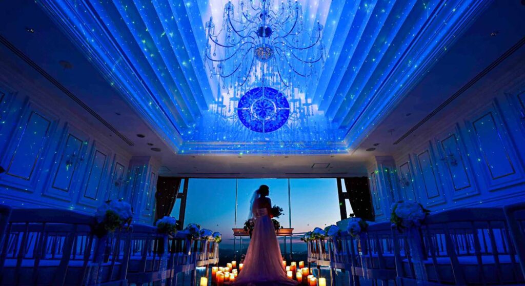 幻想的な星空の中、美しく雄大な眺望へ続くバージンロードを